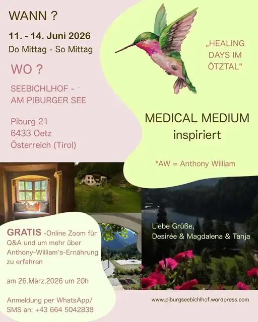 Am 26.3.2026 gibt es um 20:00 Uhr ein kostenloses Q&A Online Meeting für alle Interessierten. Magdalena und Desirée stehen live für Fragen zum Thema Ernährung nach Anthony William oder für Fragen zum Retreat zur Verfügung. Anmeldung gerne per WhatsApp oder per SMS unter 0664/5042838.